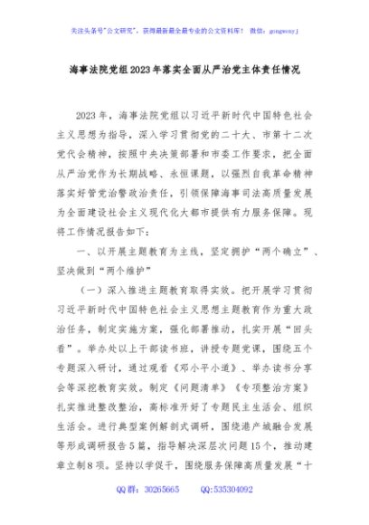 / 海事法院党组2023年落实全面从严治党主体责任情况