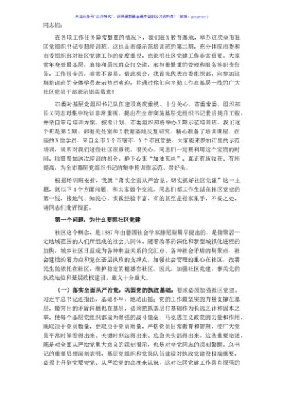 / 落实全面从严治党 切实抓好社区党建——组织部副部长在全市社区党组织书记专题培训班上的辅导报告