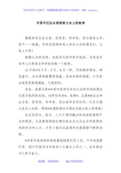 / 市委书记在全球招商大会上的致辞