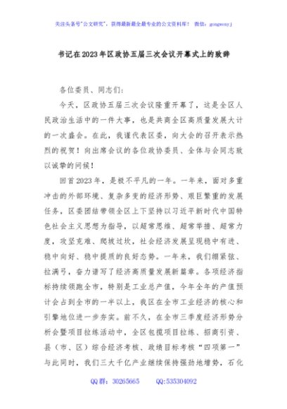 / 书记在2023年区政协五届三次会议开幕式上的致辞