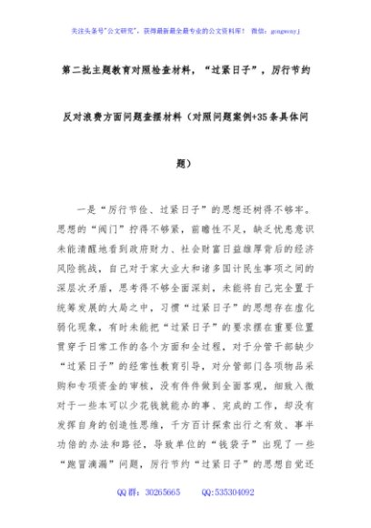 / 第二批主题教育对照检查材料,“过紧日子”,厉行节约反对浪费方面问题查摆材料(对照问题案例+35条具体问题)