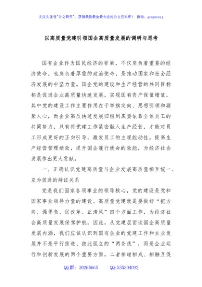 / 以高质量党建引领国企高质量发展的调研与思考