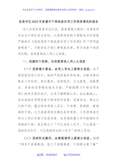 / 县委书记2023年度履行干部选拔任用工作职责情况的报告