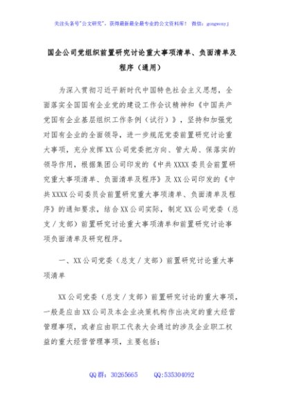 / 国企公司党组织前置研究讨论重大事项清单、负面清单及程序(通用)