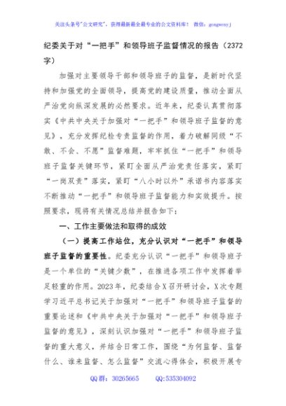 / 纪委关于对“一把手”和领导班子监督情况的报告