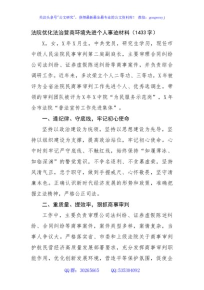 / 法院优化法治营商环境先进个人事迹材料