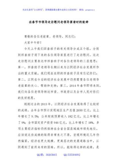 / 在春节市领导走访慰问老领导宴请时的致辞