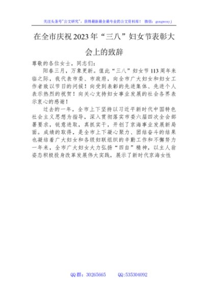 / 在全市庆祝2023年“三八”妇女节表彰大会上的致辞