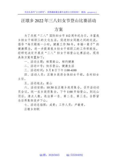 / 汪墩乡2022年三八妇女节登山比赛活动 方案