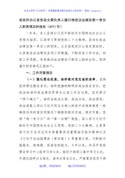县政府办公室党政主要负责人履行推进法治建设第一责任人职责情况的报告