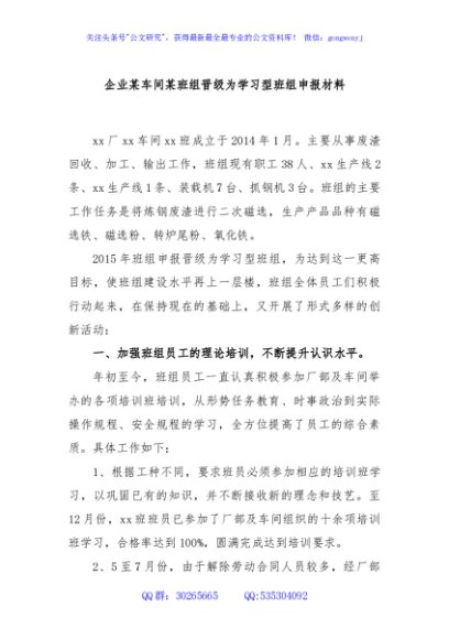 / 企业某车间某班组晋级为学习型班组申报材料