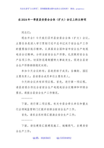 / 在2024年一季度县安委会全体(扩大)会议上的主持词