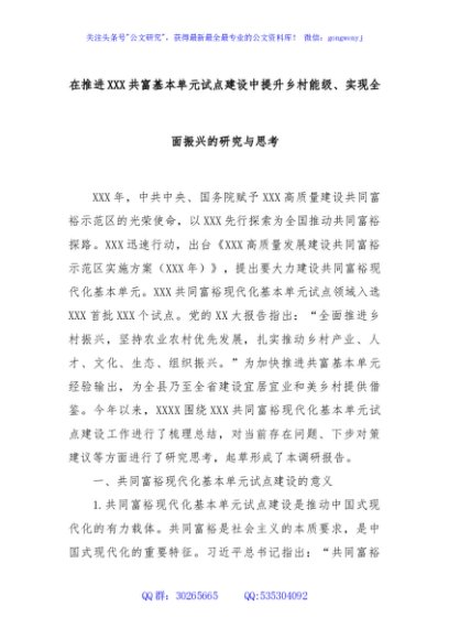 / 在推进XXX共富基本单元试点建设中提升乡村能级、实现全面振兴的研究与思考