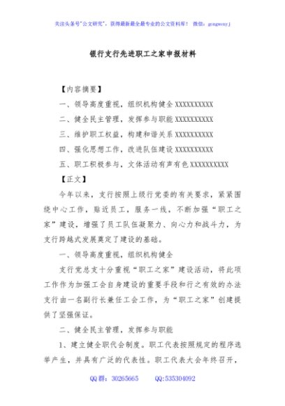 / 银行支行先进职工之家申报材料