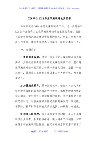 / XXX单位2024年党风廉政建设责任书