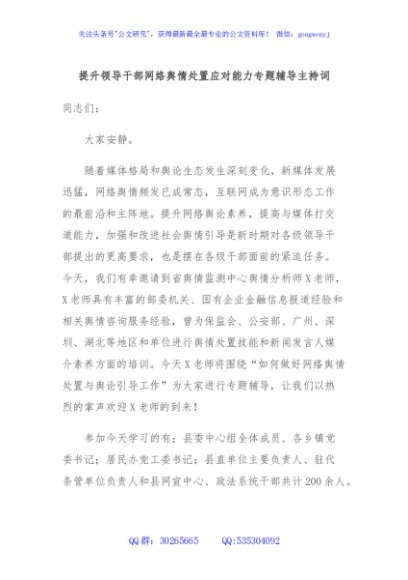 / 提升领导干部网络舆情处置应对能力专题辅导主持词