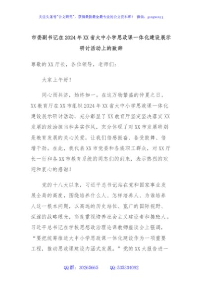 / 市委副书记在2024年XX省大中小学思政课一体化建设展示研讨活动上的致辞