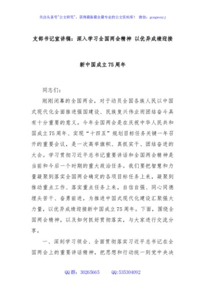 / 支部书记宣讲稿:深入学习全国两会精神 以优异成绩迎接新中国成立75周年