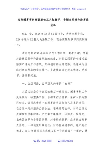 / 法院刑事审判庭副庭长三八红旗手、巾帼文明岗先进事迹材料
