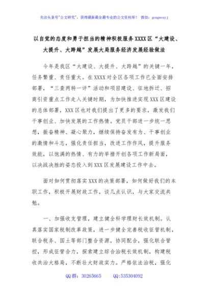 / 以自觉的态度和勇于担当的精神积极服务XXXX区“大建设、大提升、大跨越”发展大局服务经济发展经验做法
