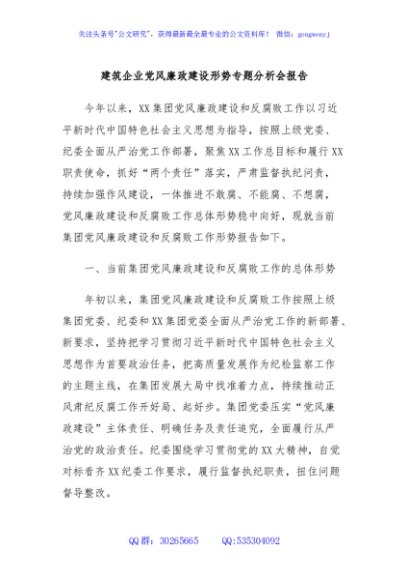 / 建筑企业党风廉政建设形势专题分析会报告