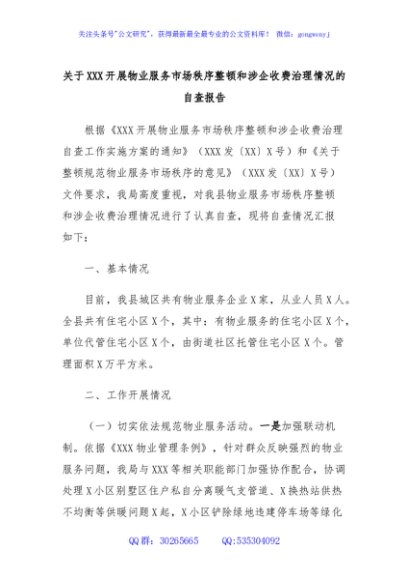 / 关于XXX开展物业服务市场秩序整顿和涉企收费治理情况的自查报告