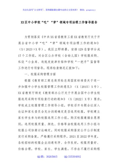 / XX区中小学校“吃”“穿”领域专项治理工作督导报告