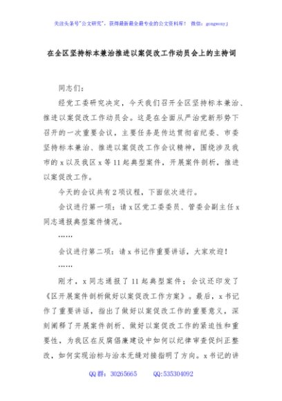 / 在全区坚持标本兼治推进以案促改工作动员会上的主持词