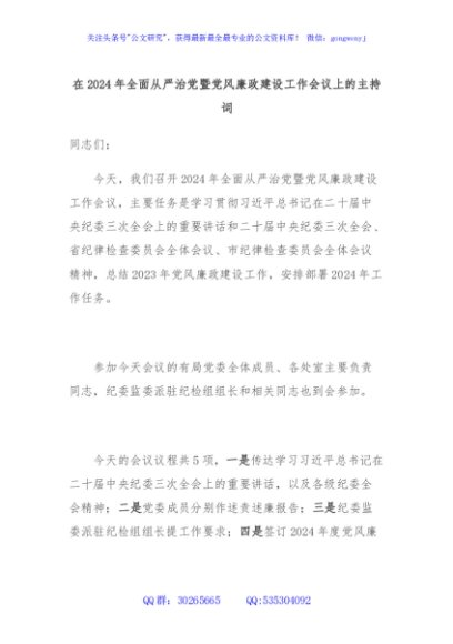 / 在2024年全面从严治党暨党风廉政建设工作会议上的主持词