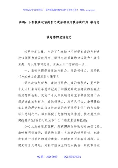 / 讲稿:不断提高政治判断力政治领悟力政治执行力 锻造忠诚可靠的政治能力