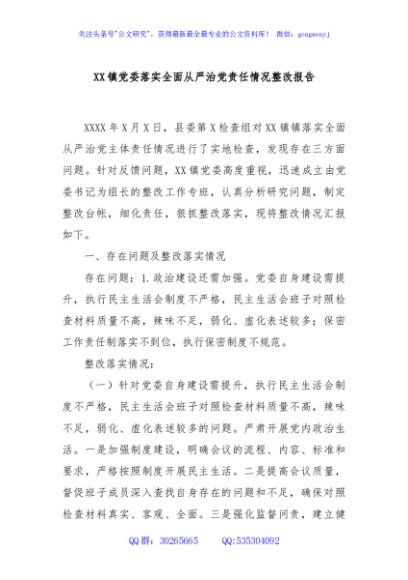 / XX镇党委落实全面从严治党责任情况整改报告
