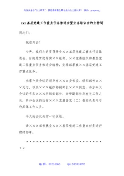 / xxx基层党建工作重点任务推进会暨业务培训会的主持词