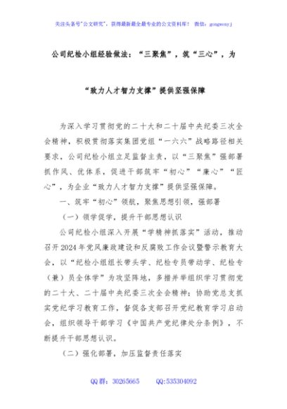 / 公司纪检小组经验做法:“三聚焦”,筑“三心”,为“致力人才智力支撑”提供坚强保障