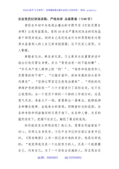 / 国企党员纪律演讲稿:严格自律 永葆青春