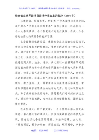/ 检察长在世界读书日读书分享会上的致辞(2101字)