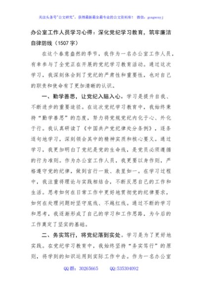 / 办公室工作人员学习心得:深化党纪学习教育,筑牢廉洁自律防线(1507字)