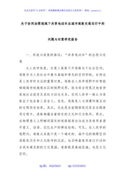 / 关于协同治理视域下共享电动车在城市道路交通运行中的问题与对策研究报告