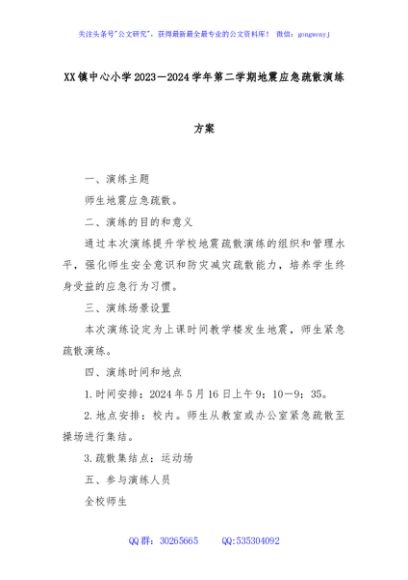 / XX镇中心小学2023-2024学年第二学期地震应急疏散演练方案