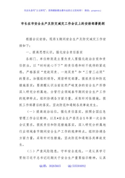 / 市长在市安全生产及防灾减灾工作会议上的安排部署提纲