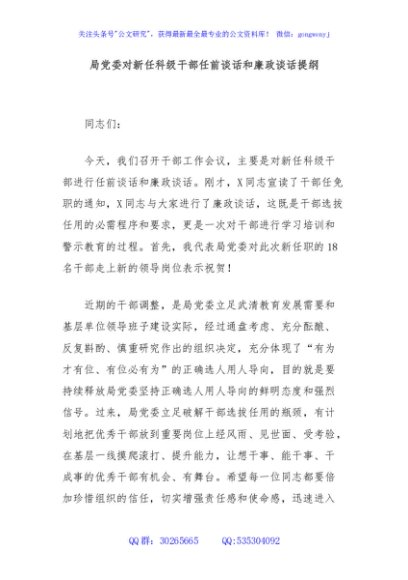 / 局党委对新任科级干部任前谈话和廉政谈话提纲