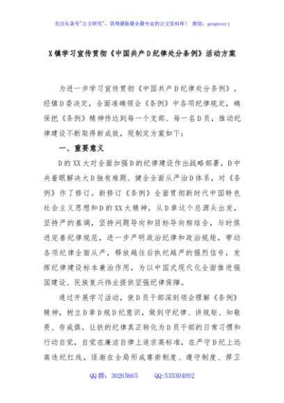 / X镇学习宣传贯彻《中国共产D纪律处分条例》活动方案