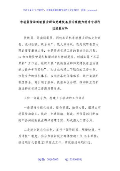 / 市场监管局抓新就业群体党建促基层治理能力提升专项行动经验材料