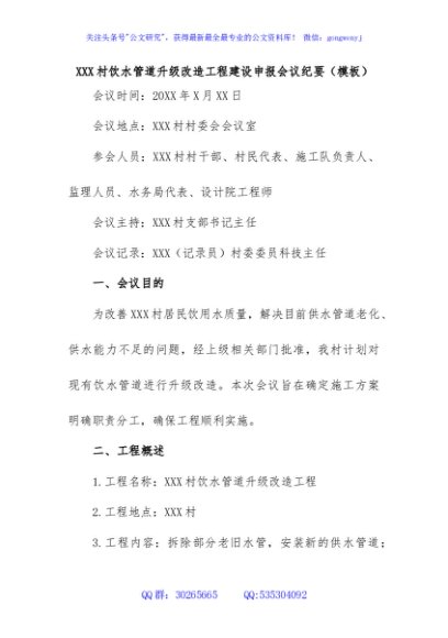/ XXX村饮水管道升级改造工程建设申报会议记录