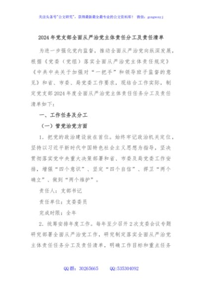 / 2024年党支部全面从严治党主体责任分工及责任清单
