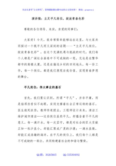 / 演讲稿:立足平凡岗位,绽放青春色彩