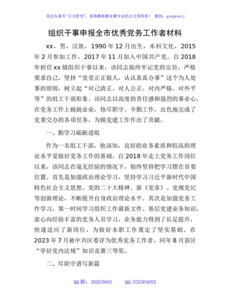 / 2024组织干事申报全市优秀党务工作者材料(事迹)