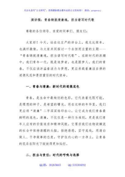 / 演讲稿:青春铸就清廉魂,担当谱写时代歌