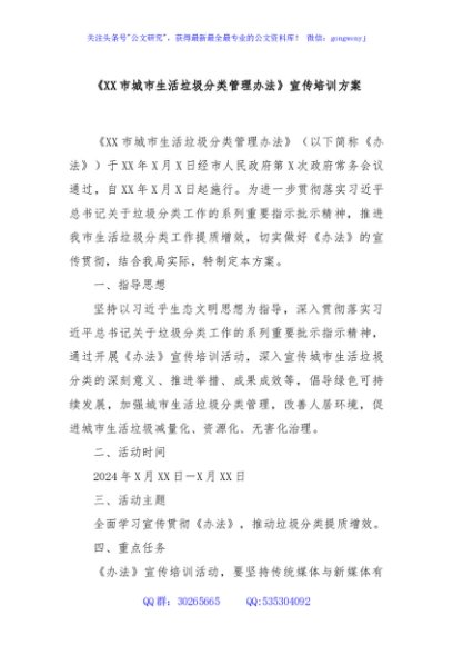 / 《XX市城市生活垃圾分类管理办法》宣传培训方案