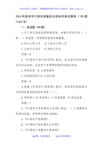 / 2024年度领导干部任前廉政法规知识测试题库(150题11437字)