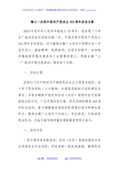 / 镇七一庆祝中国共产党成立103周年活动方案